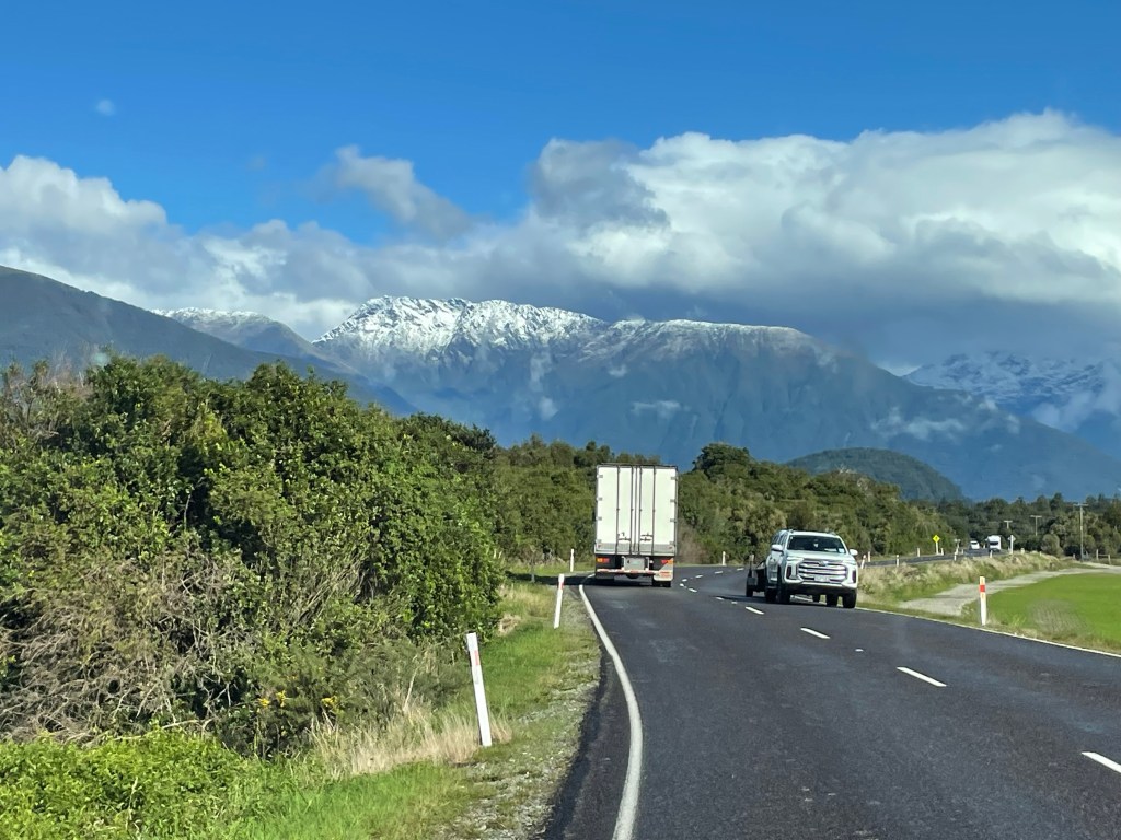 With snow capped mountains already visible, we headed for Arthur’s Pass. I think we were both expecting somewhere like Charlotte’s Pass in the Aussie Alps, a narrow pass with snow all about us. But no, it was a small non-descript town with a railway station. Over the western side of the Pass was a narrow steep winding road with a huge gorge of violently rushing aqua glacial water. We took a shortcut turn off to Greymouth, our destination for the night.