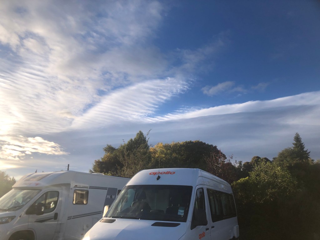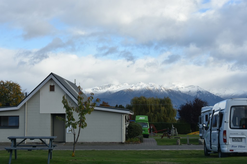 We parked in the holiday park close to town. We could see the lake and the snow capped mountains from our site. Kids still ran around in shorts, screamed loudly on the bouncy trampoline and talked to each other on walky-talkies as they zoomed about on bikes. On the second morning, I lay snuggly in bed and watched the snow falling on the nearby hill. What a treat! A local told Nick it was very unusual in May to see snow…it was April! He also said “snow fall in May never stays” is a local belief. But for us it was picture perfect.