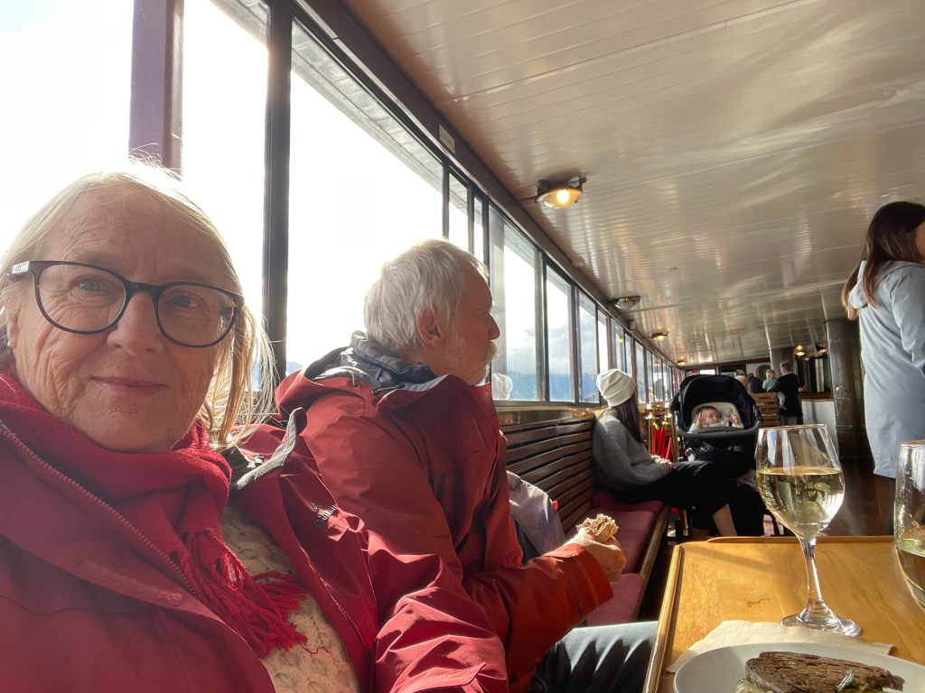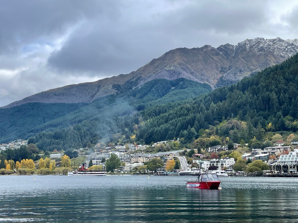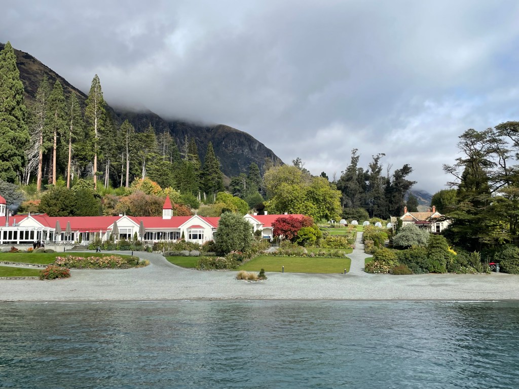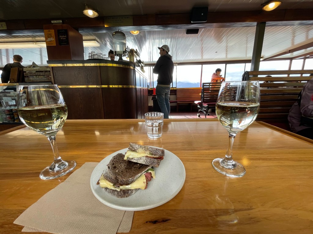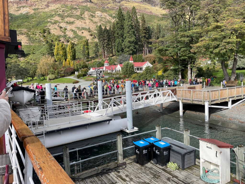 We loved the trip, Nick was fascinated by the internal workings of the motors. We had a calm trip, just a bit crowded by holiday makers originating from Asia. The captain berthed the boat at Walter Peak High Country Farm, then announced that all those who’d paid for lunch and the cruise would disembark here at the charming early colonial restaurant at the edge of the lake. To our surprise, 99% of the aforementioned got off, then followed their guide with the blue flag and went to lunch. So our return cruise to Queenstown was peaceful, and definitely warranted a shared pastrami sandwich and a glass of wine.
